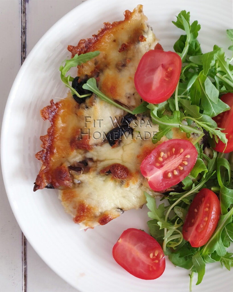 Wypieczoną pizzę pozostawiamy na ok. 5-10′, by nasza baza z kurczaka się „ścieła” i była na tyle zwarta, by można ją było wcinać, jak najprawdziwszą pizzę. Po tym czasie pokrojoną na kawałki pizzę, kładziemy na talerzach, dekorujemy rukolą, pomidorkami i voila.