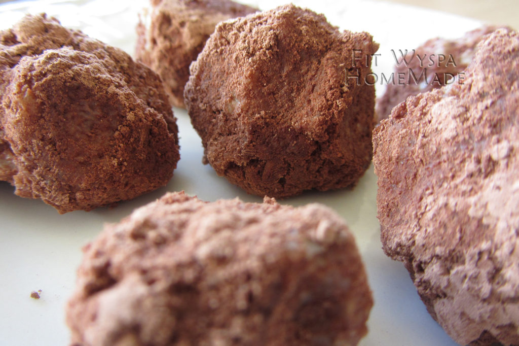 Orzechy i daktyle moczymy na noc. Następnego dnia dokładnie blendujemy, pozostawiając nieco wody, w której się moczyły. Lepimy zgrabne kulki – dzieciaki to uwielbiają – i obtaczamy w kakao. Jeśli ktoś woli, może obtoczyć we wiórkach kokosowych 🙂 Smacznego!